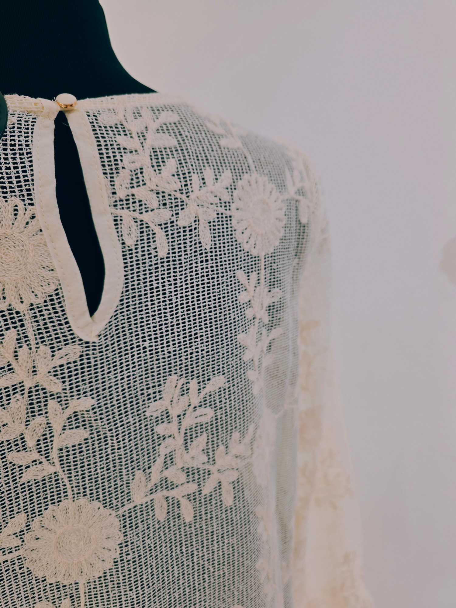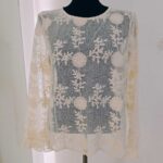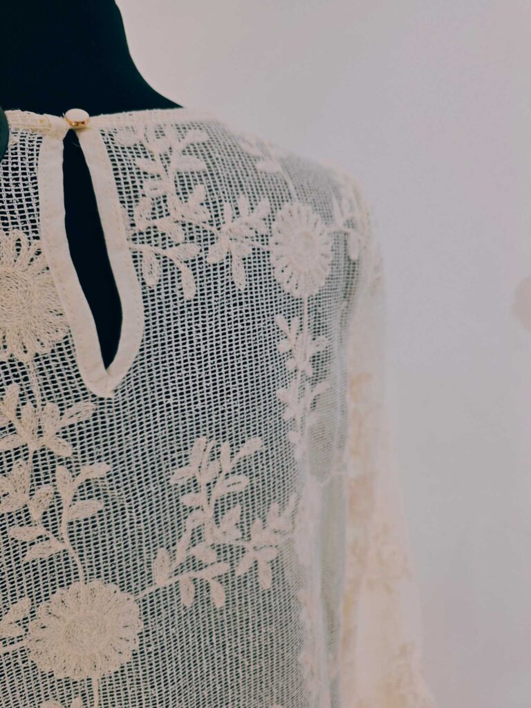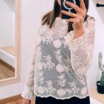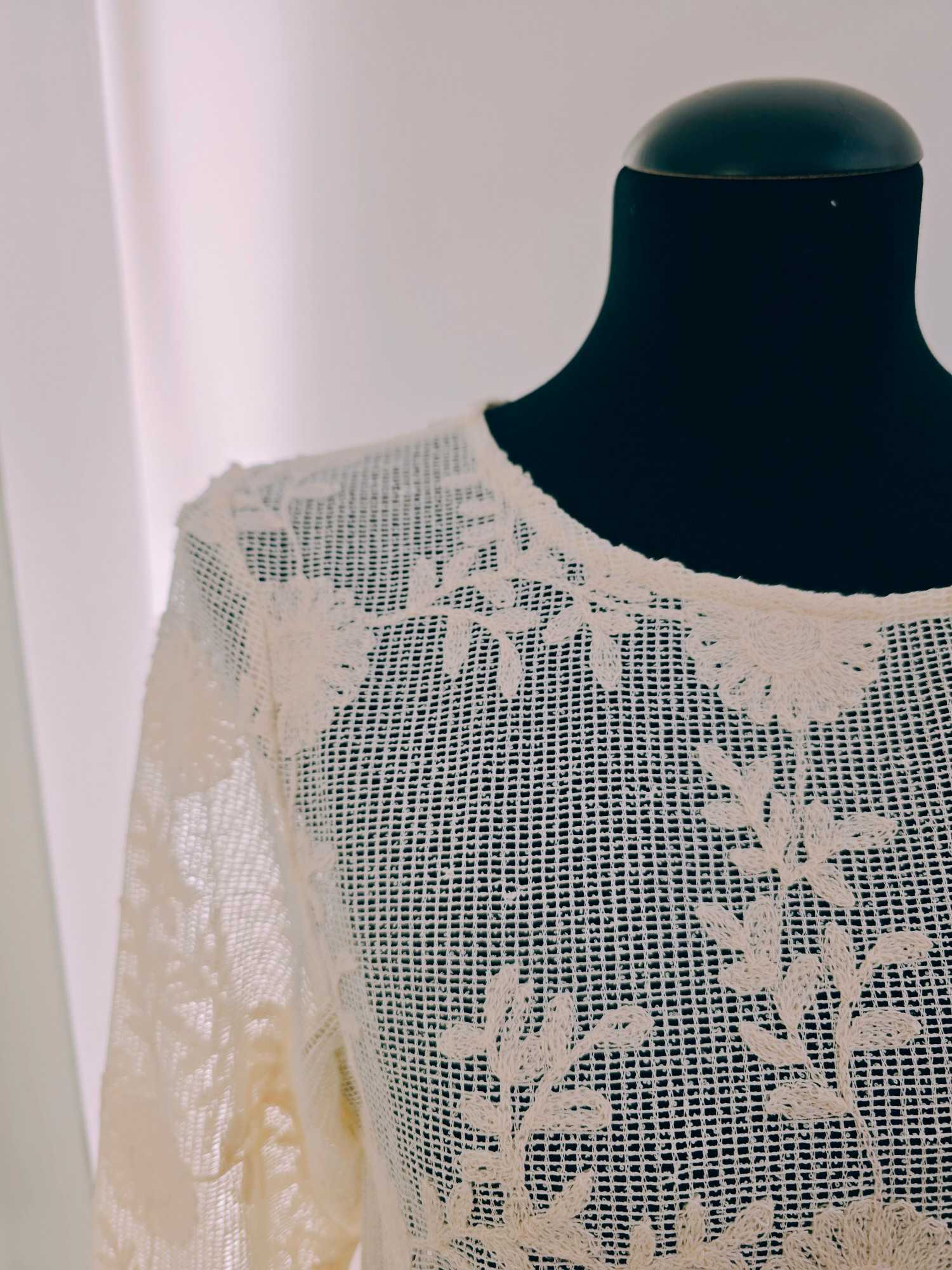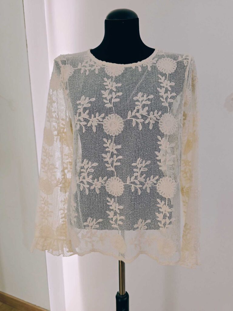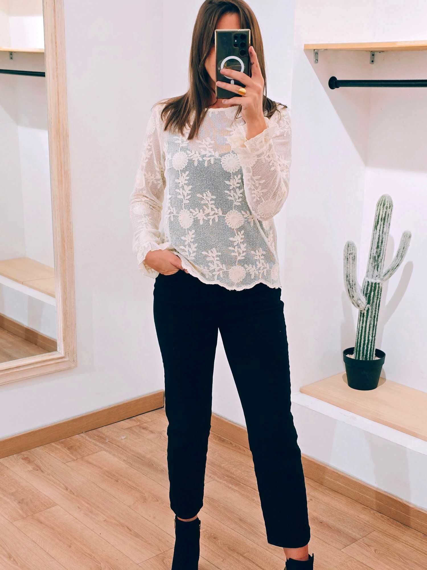 Cette blouse associe une maille ajourée façon filet à de fines broderies florales ton sur ton. Le résultat : une pièce lumineuse, subtilement rétro et ultra chic.