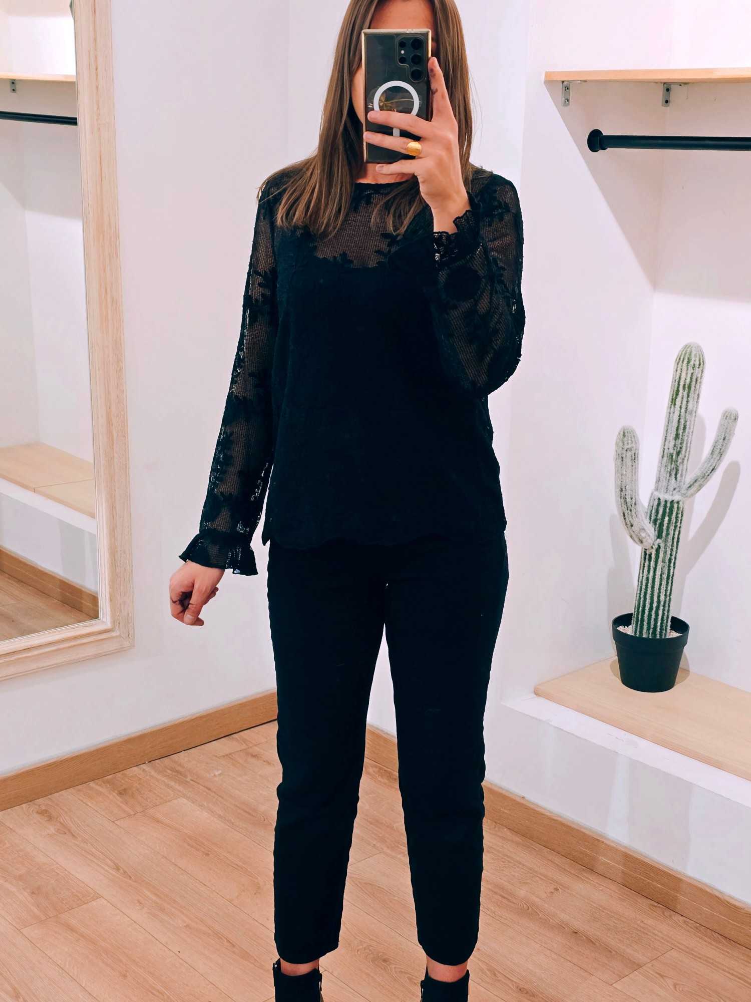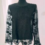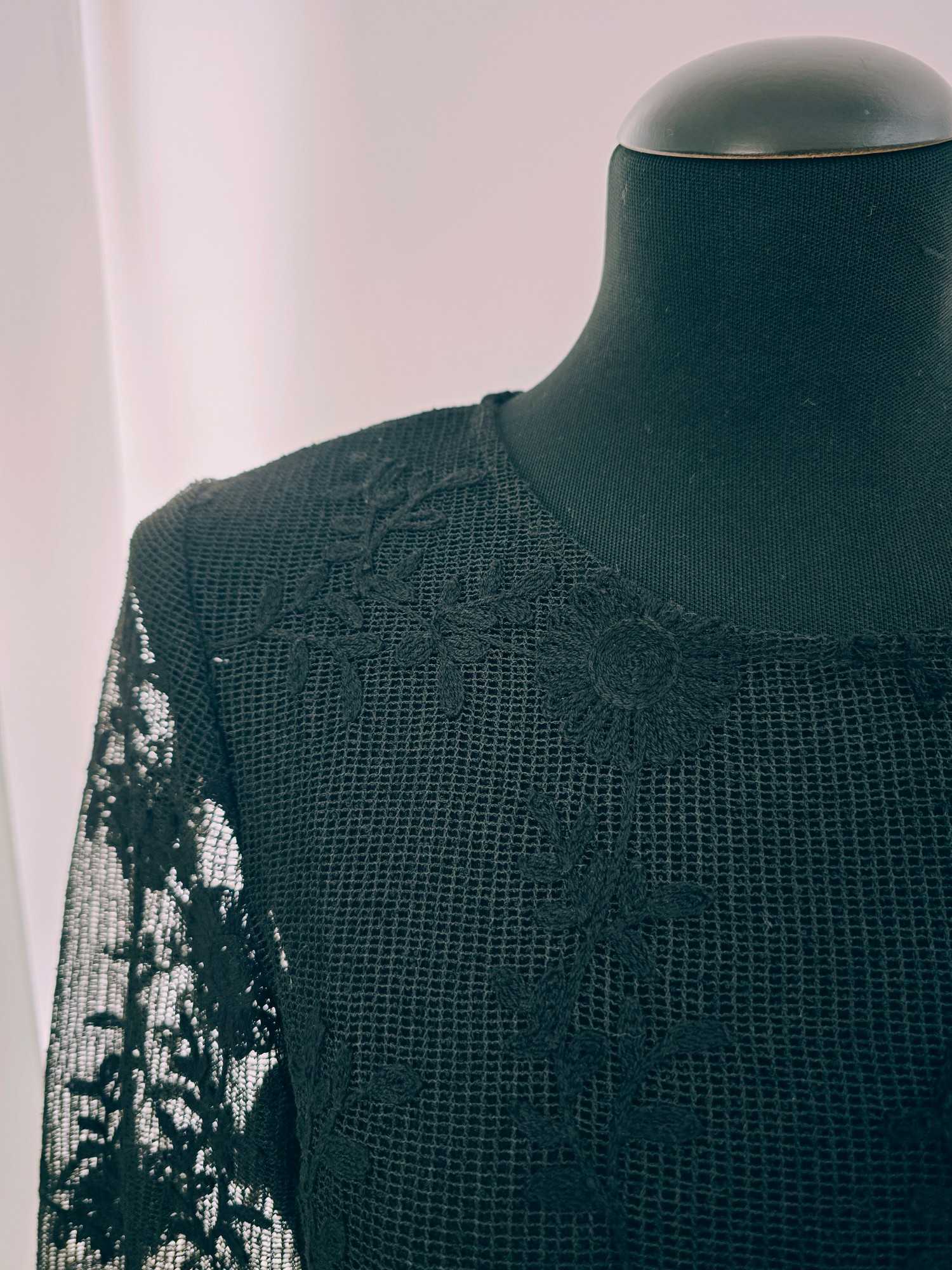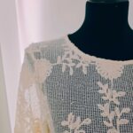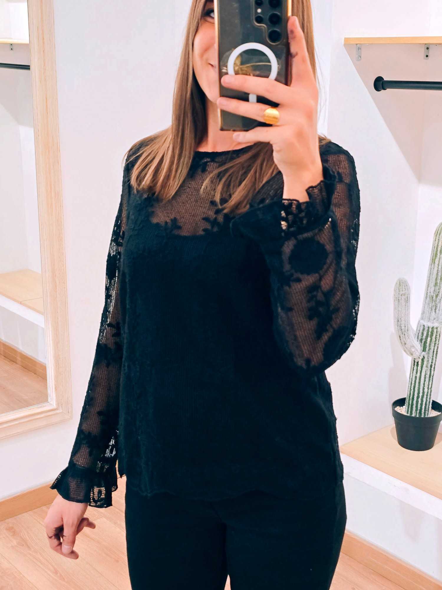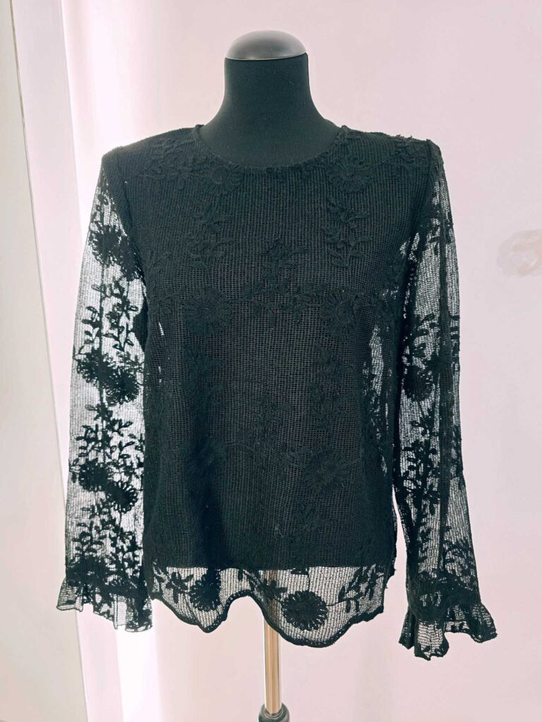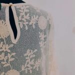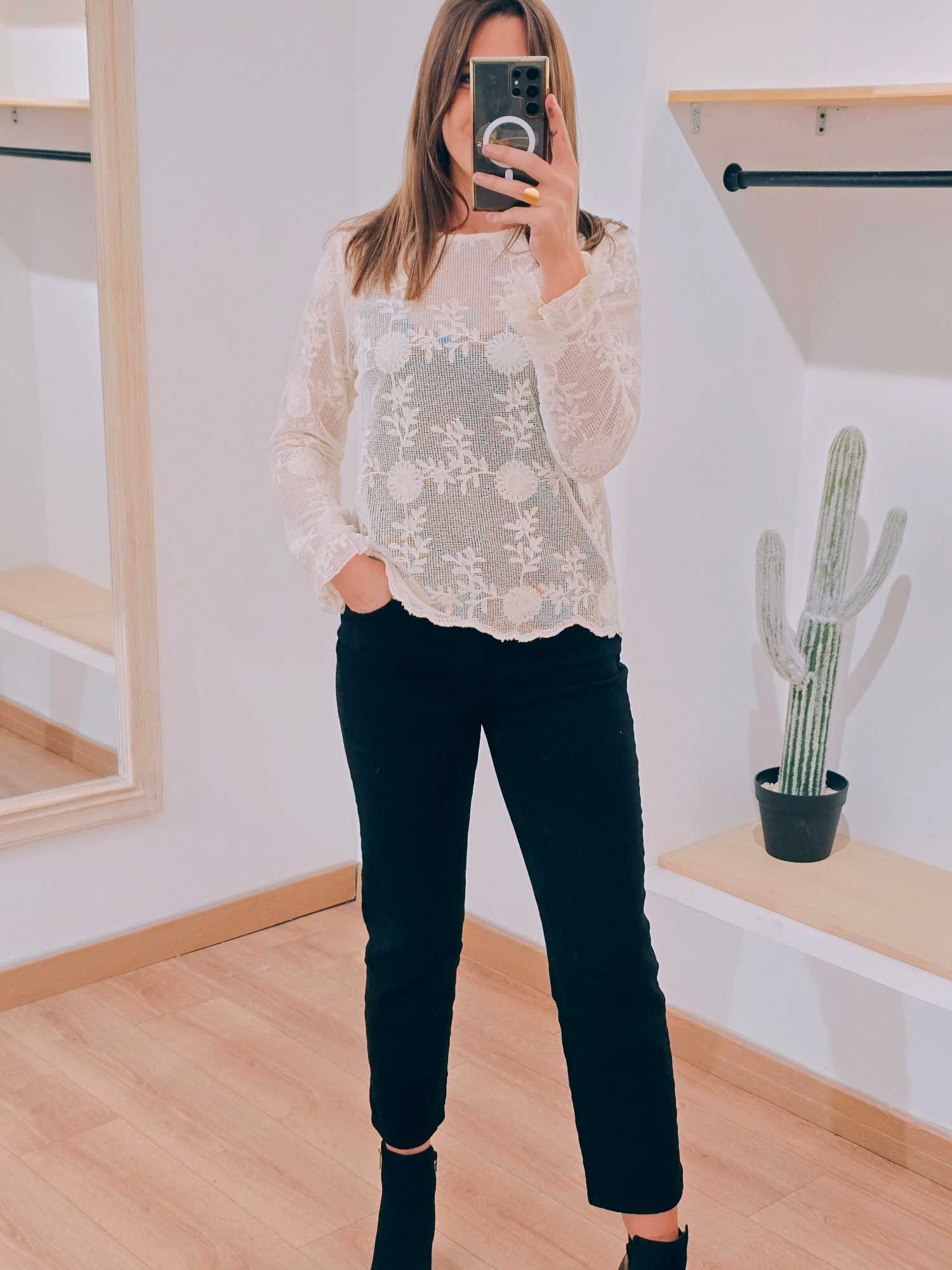 Cette blouse associe une maille ajourée façon filet à de fines broderies florales ton sur ton. Le résultat : une pièce lumineuse, subtilement rétro et ultra chic.