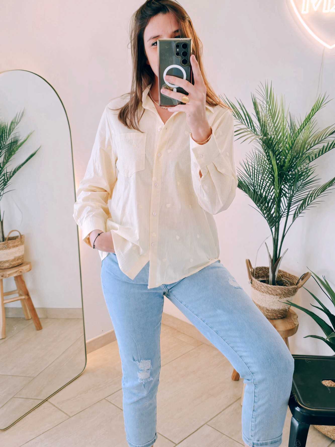 Facile à associer, cette chemise se porte aussi bien avec un jean qu’une jupe ou un pantalon habillé. Sa coupe confortable convient à toutes les silhouettes et s’adapte aussi bien à une tenue de bureau qu’à un look casual chic.