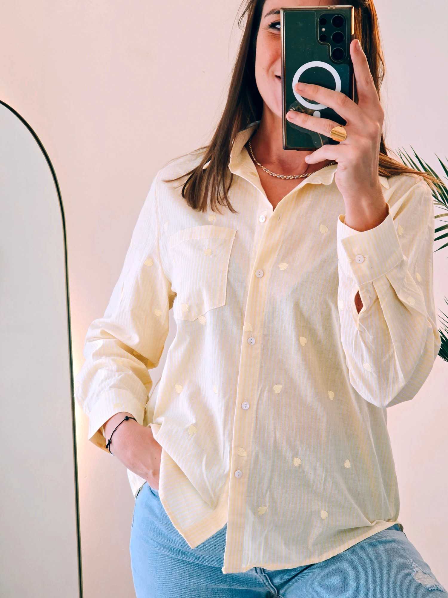Apportez une touche de charme à votre dressing avec cette chemise rayée à cœurs brodés, parfaite alliance entre élégance et originalité. Confectionnée dans une matière légère et agréable à porter, elle se distingue par ses rayures intemporelles sublimées par de délicats cœurs brodés, pour un style à la fois romantique et moderne.