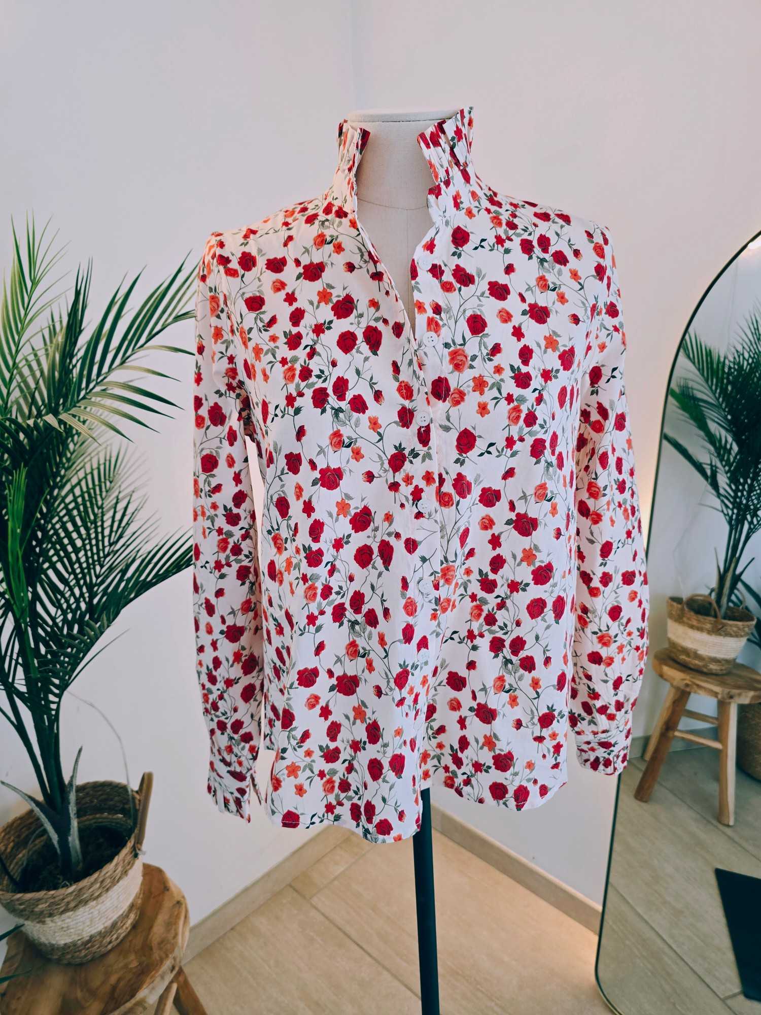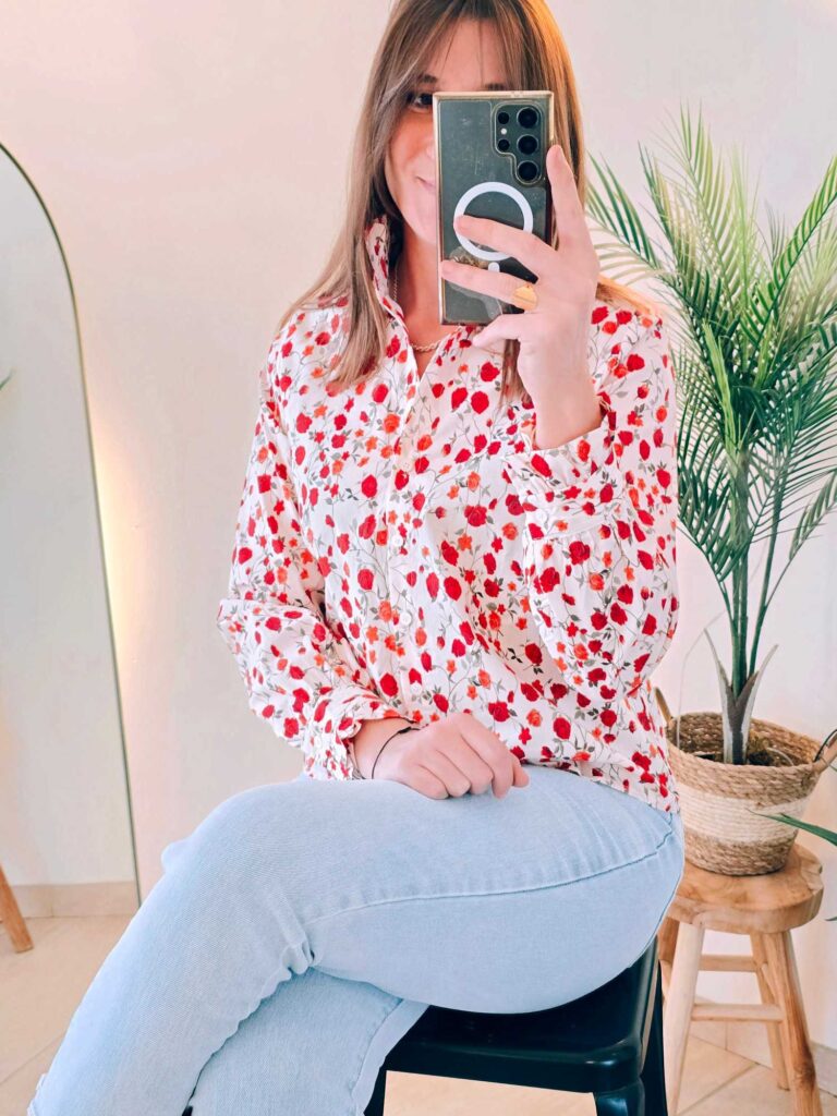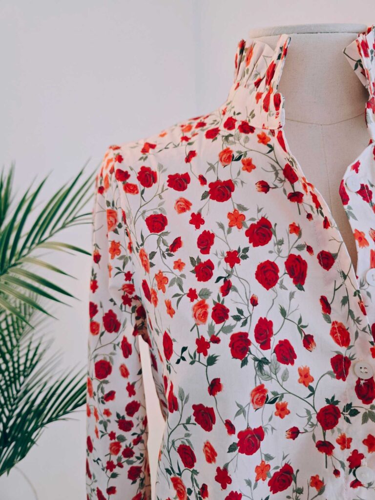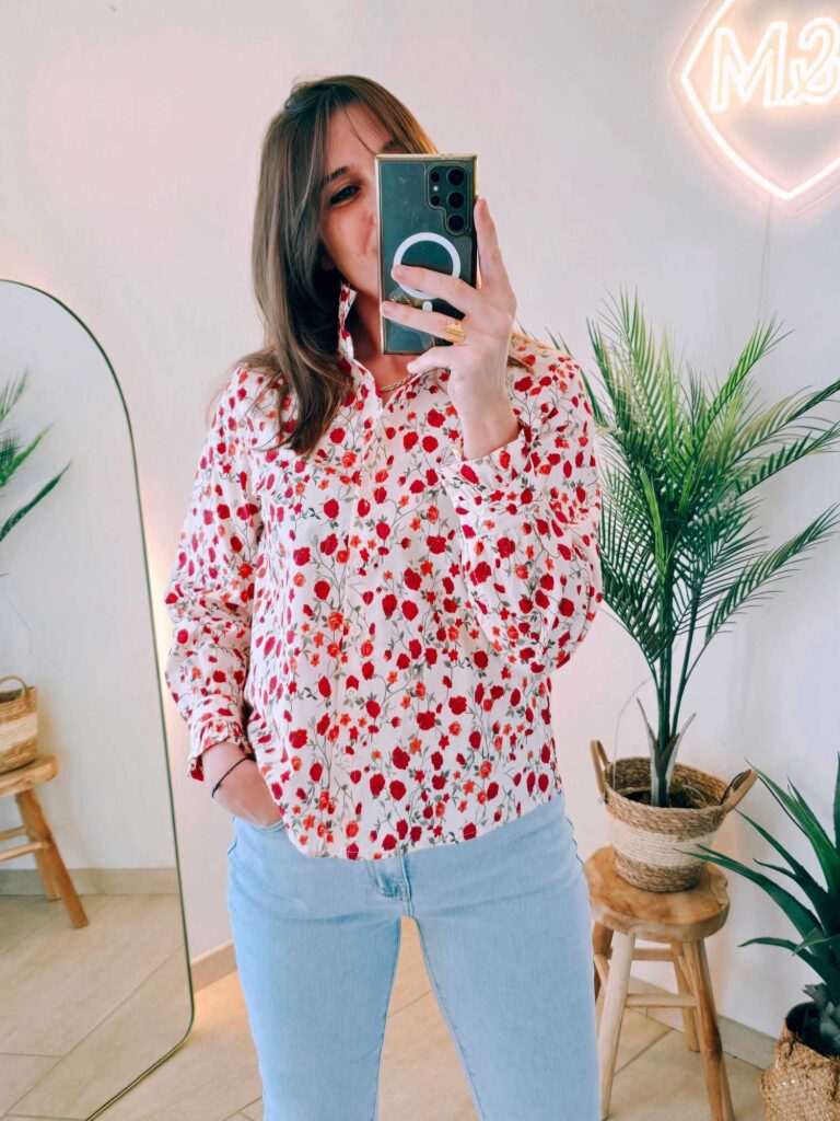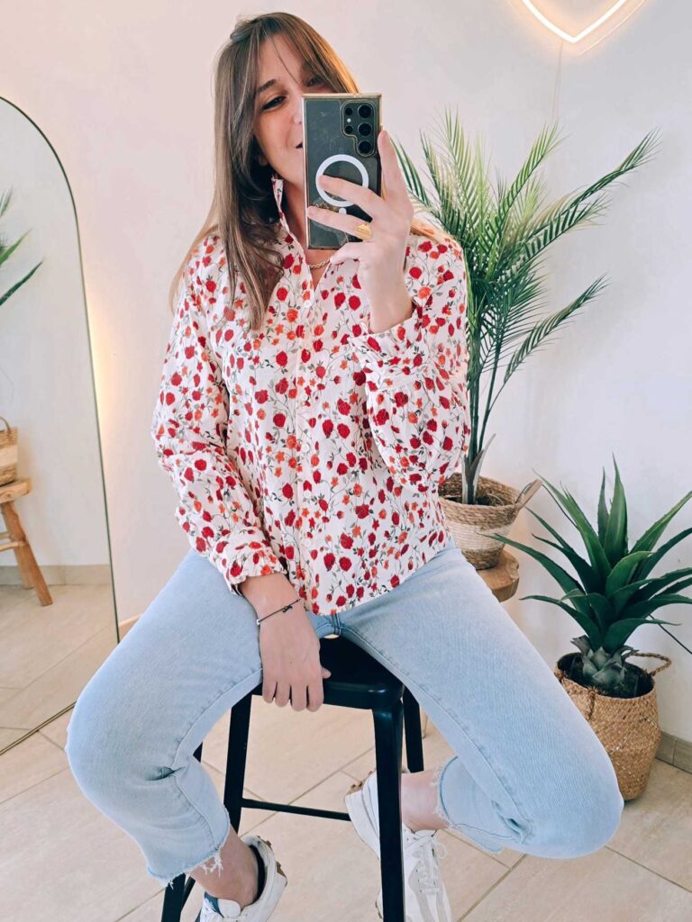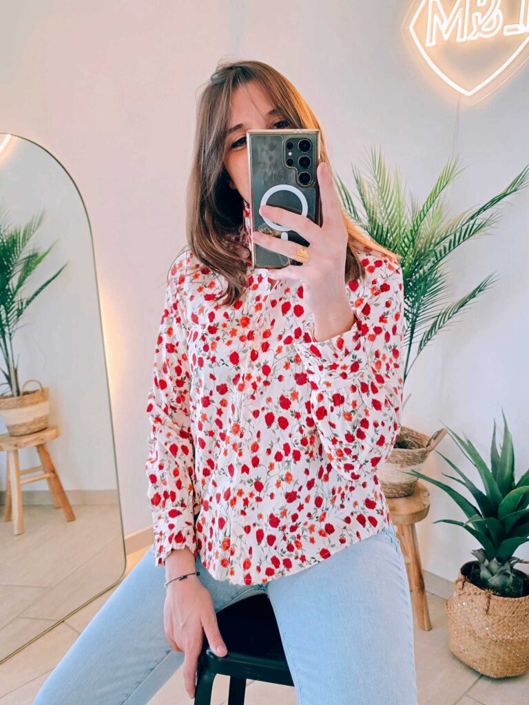 Sublimez votre style avec ce chemisier fleuri en coton, une pièce à la fois féminine et confortable. Son col montant délicatement décoré de froufrous apporte une touche romantique et raffinée, tandis que l’imprimé floral illumine vos tenues avec légèreté et fraîcheur.