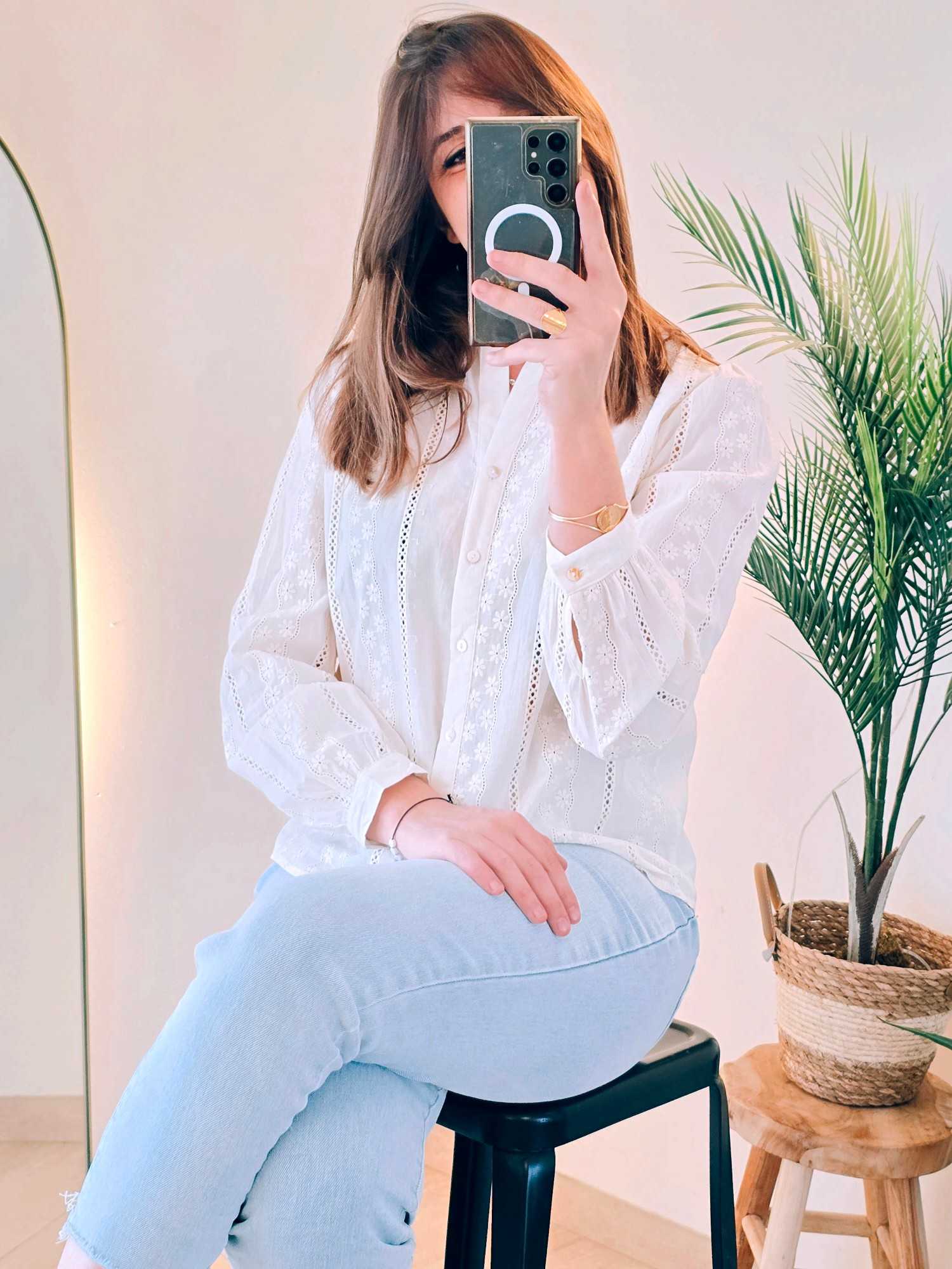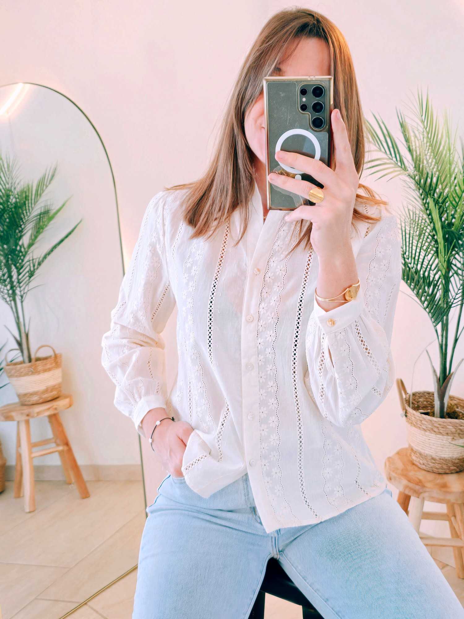 Les broderies délicates ton sur ton ajoutent un effet texturé élégant, tandis que le col ouvert apporte féminité et décontraction. Confectionné dans une matière légère et agréable à porter, ce chemisier allie confort et style.
