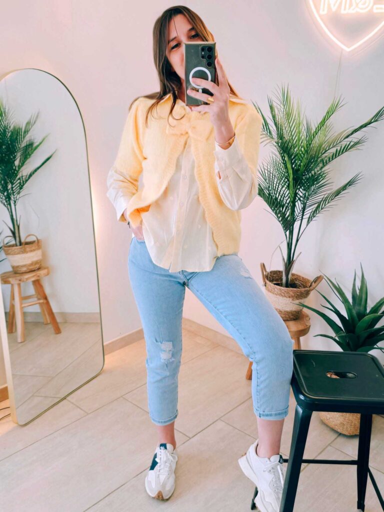 Confectionné dans une matière douce et agréable à porter, ce gilet se superpose facilement sur une chemise, un t-shirt ou une blouse, tout en ajoutant un détail original grâce au nœud papillon. Une pièce polyvalente qui allie confort et style.