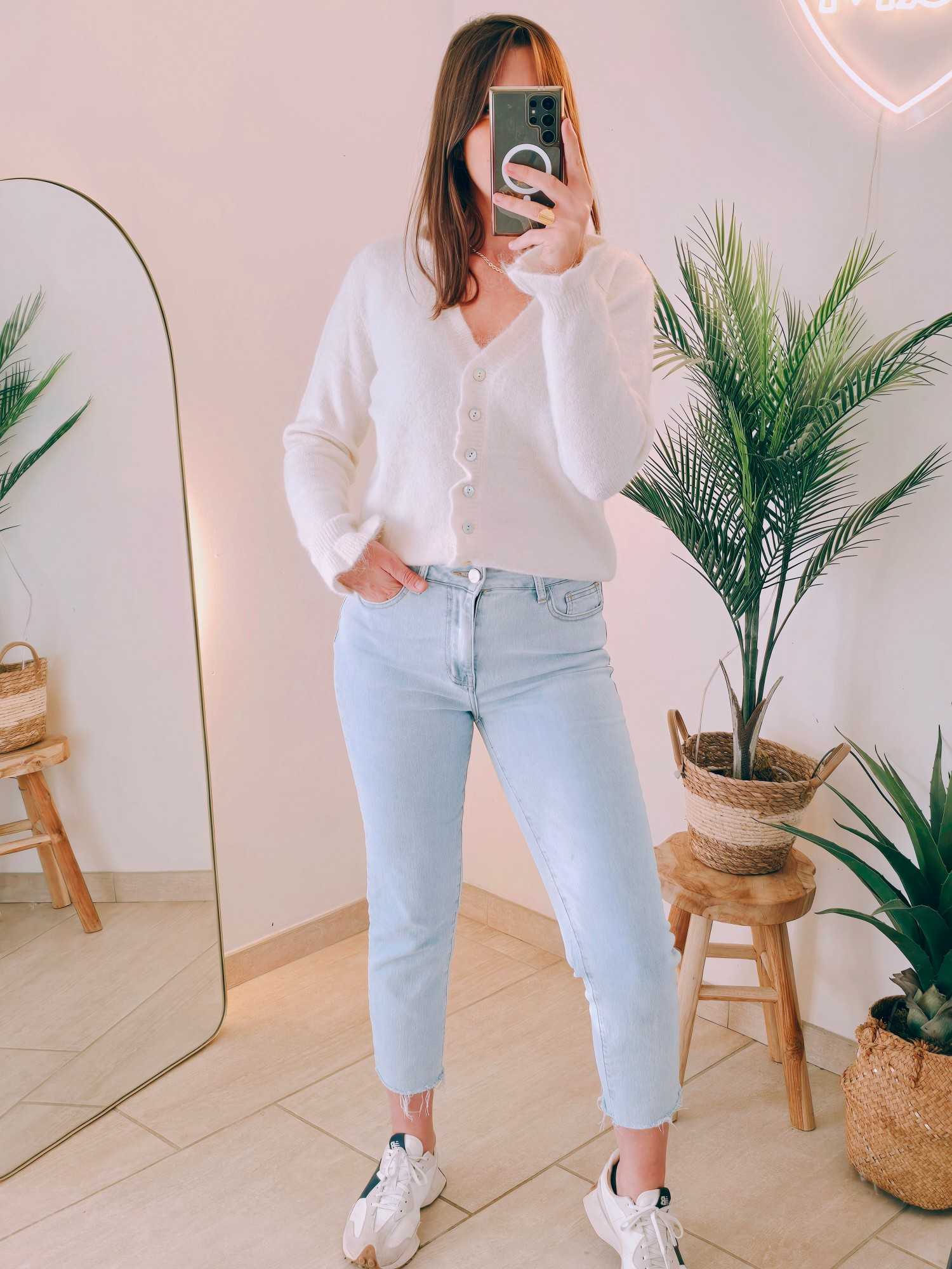 Confectionné dans un denim clair facile à associer, ce jean se porte aussi bien avec un t-shirt basique qu’un pull ou une blouse pour créer des tenues casual chic en toute saison.