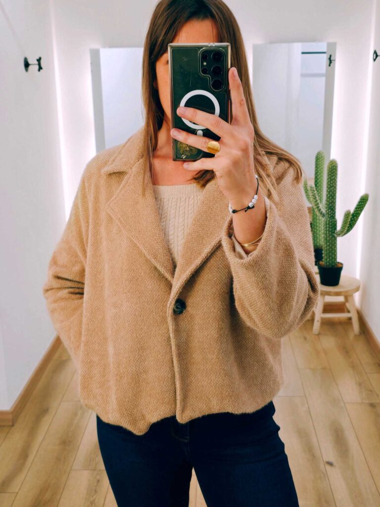 La fermeture simple à un bouton apporte une touche minimaliste et moderne, permettant de le porter ouvert ou fermé selon vos envies. Ce manteau est idéal pour compléter un jean slim, une robe ou une jupe et se marie avec des bottines ou des sneakers pour un look urbain et sophistiqué.