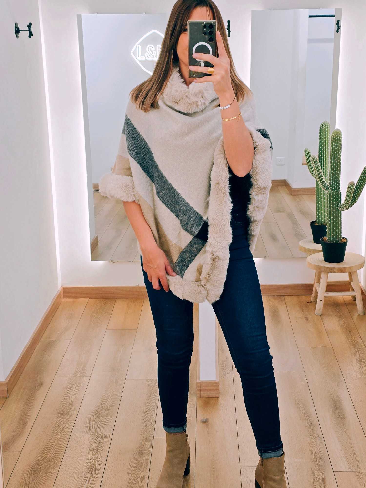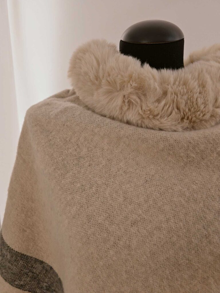 Restez chic et bien au chaud avec notre poncho en fausse fourrure, idéal pour affronter l’hiver avec style. Ce modèle raffiné se distingue par son col en fausse fourrure moelleux et sa couture/bordure inférieure en fausse fourrure, apportant une touche d’élégance sans surcharger la pièce.