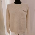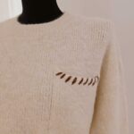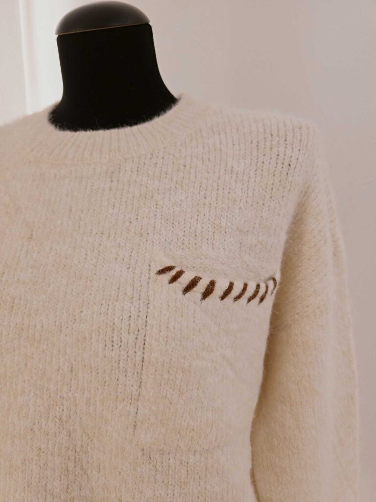 Le col rond classique encadre délicatement le cou et met en valeur la ligne du visage, tandis que la poche plaquée sur la poitrine apporte une touche d’originalité subtile. Le détail torsadé sur la poche ajoute une dimension artisanale et tendance, rappelant le charme des tricots faits main. Ce petit accent texturé donne du caractère à la pièce tout en restant sobre et facile à porter.