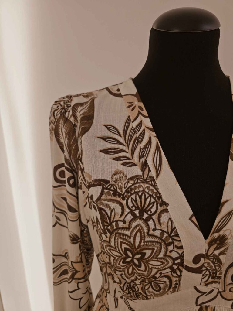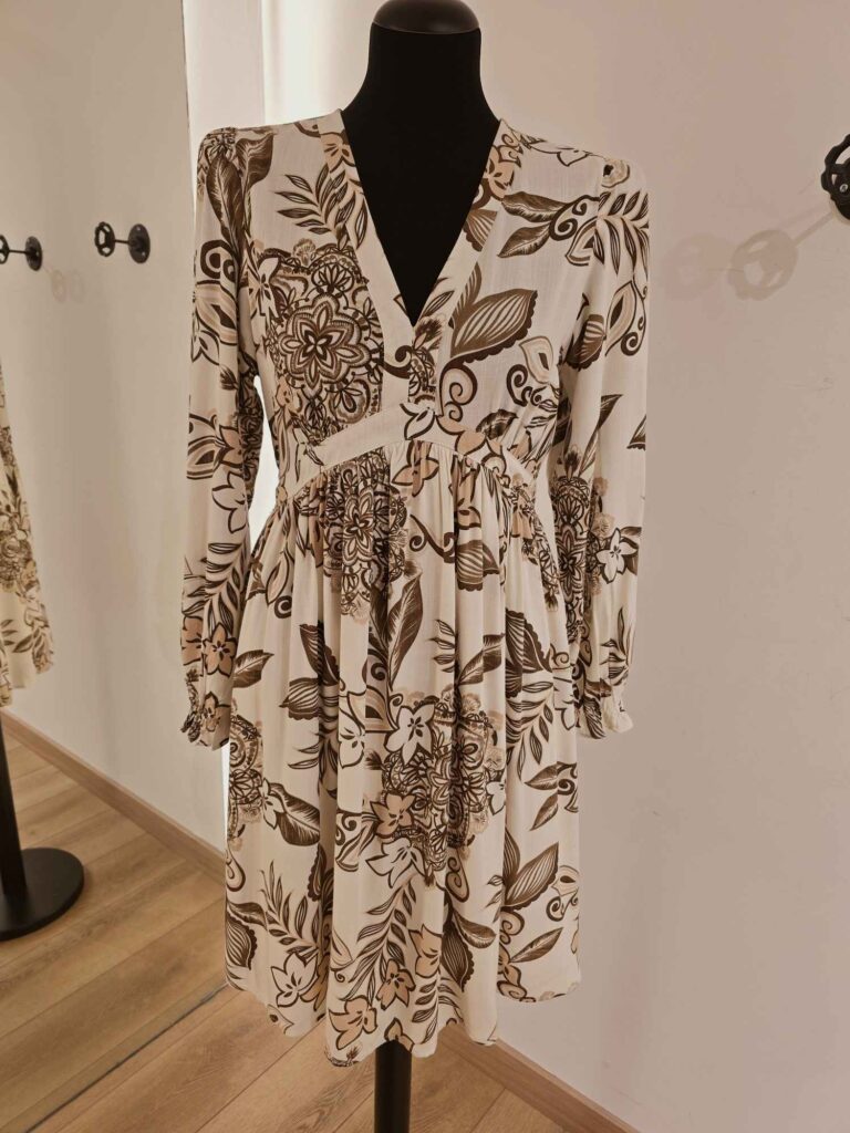 Légère, fluide et délicatement imprimée, cette robe à manches longues est la pièce idéale pour une allure chic et naturelle. Son imprimé aux nuances chocolat et camel sur fond écru évoque les tons chauds de la saison, parfait pour l’automne ou les journées douces de mi-saison.