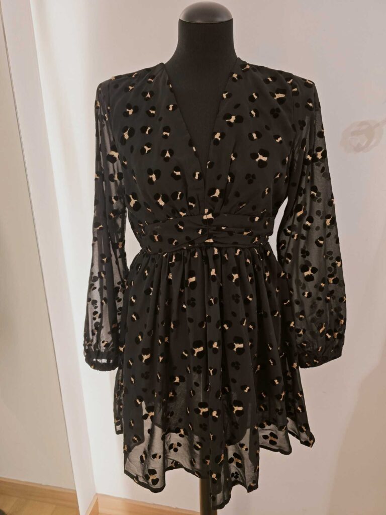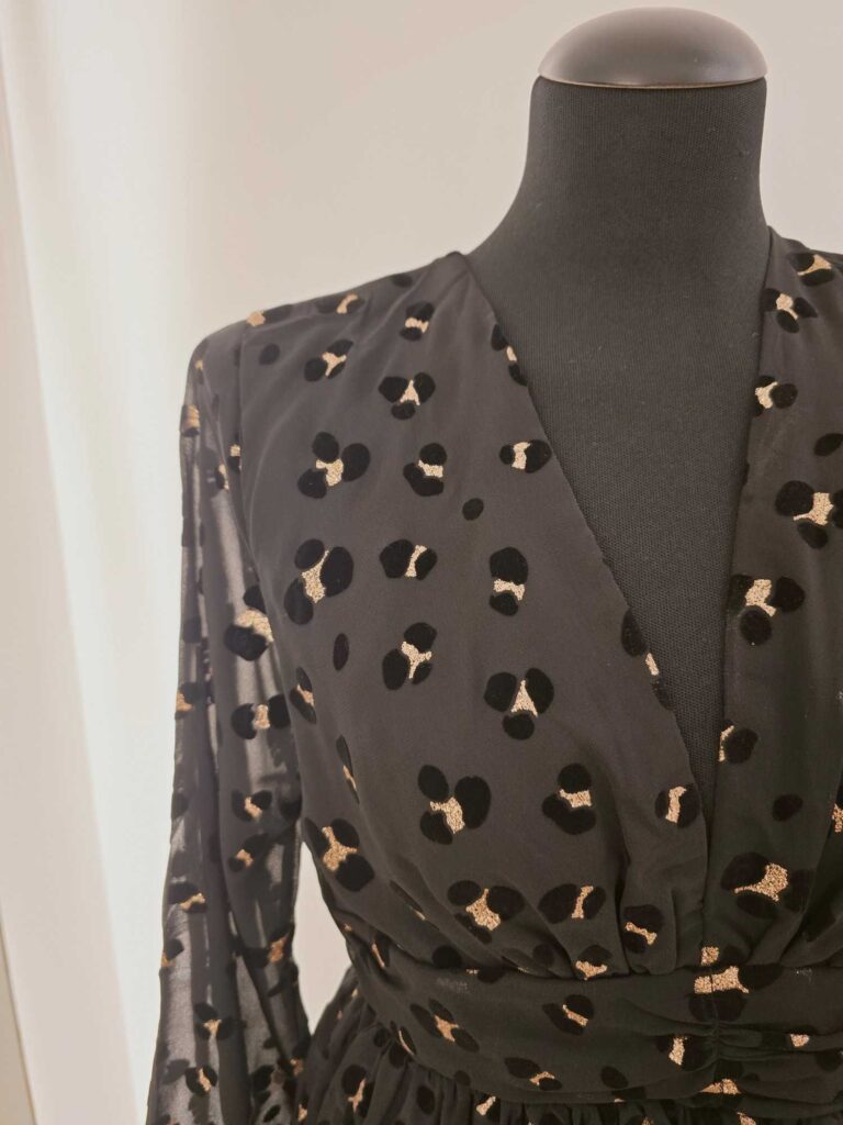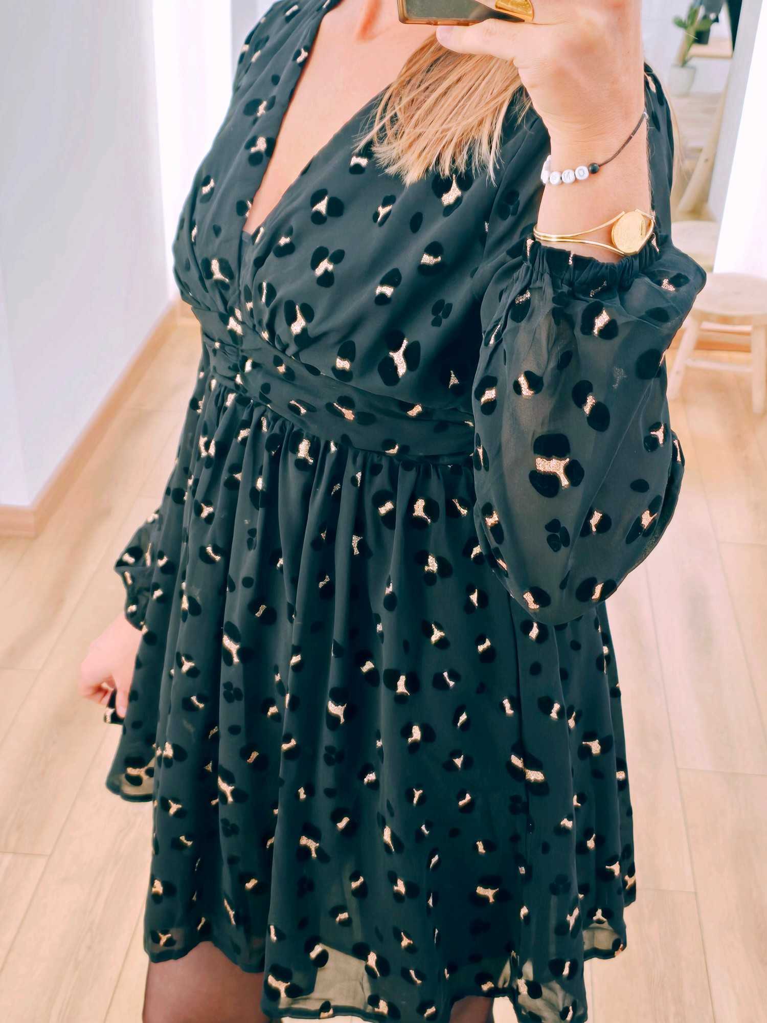 Adoptez un look audacieux et élégant avec cette robe courte cintrée à la taille, conçue pour mettre en valeur la silhouette. Son design féminin est sublimé par un imprimé léopard moderne, rehaussé d’un mélange de velours et de dorures qui apporte profondeur, relief et éclat.