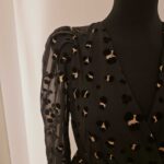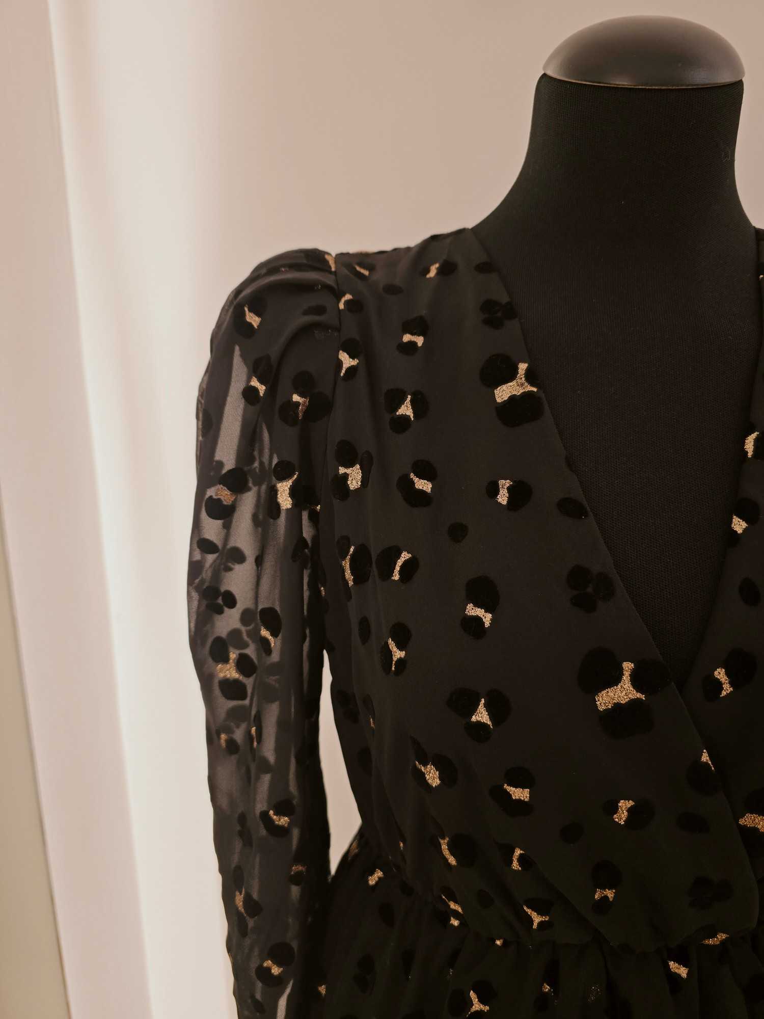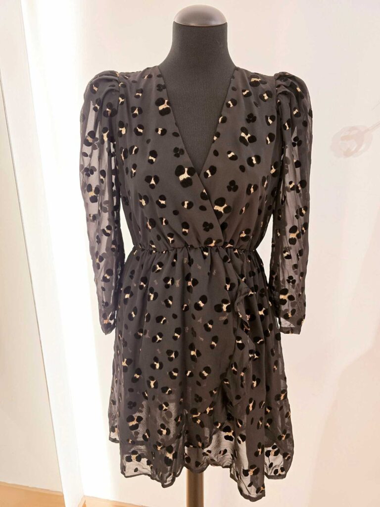 Cette robe se distingue par son imprimé léopard revisité avec des touches de velours et de doré, offrant un contraste subtil et sophistiqué. Le mélange des textures crée un effet visuel chic et lumineux, parfait pour attirer l’œil et affirmer votre style.