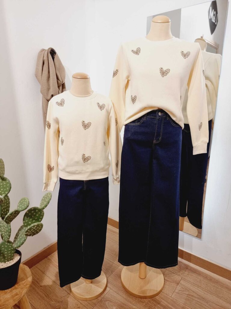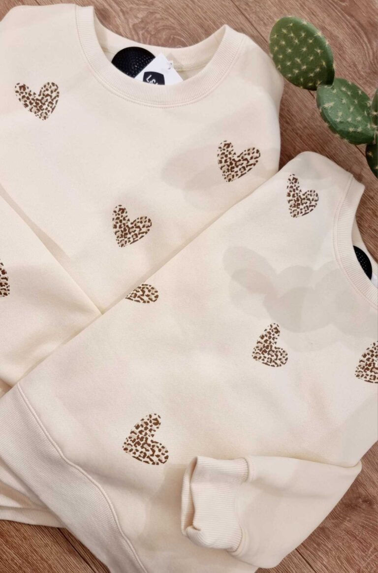 Craquez pour ce magnifique sweat col rond sans capuche, orné de cœurs imprimé léopard pour un style tendance et plein de caractère. Confortable, doux et facile à porter, il est parfait pour créer un look harmonieux et plein de complicité avec votre enfant.